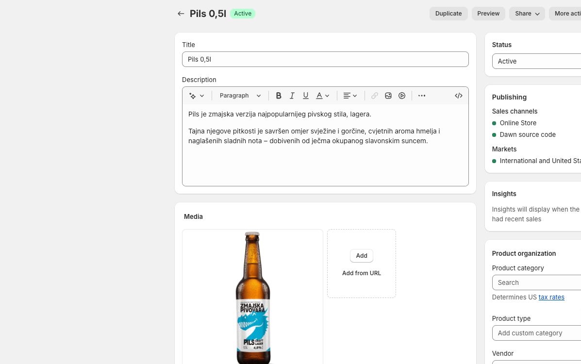 Prilagodba proizvoda: Možete prilagoditi stranice svojih proizvoda dodavanjem slika, opisa, cijena i drugih detalja putem Shopify-ovog uređivača proizvoda. Također možete koristiti aplikacije za ponudu opcija prilagodbe proizvoda poput boje, veličine ili personalizacije. Sada su i Shopify meta polja dostupna kao dio sustava (za razliku od prije kada su bila dodavana preko aplikacije).
