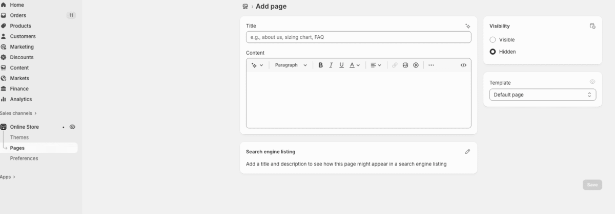 - U Shopify Adminu idite na Online Store → Pages → Add page